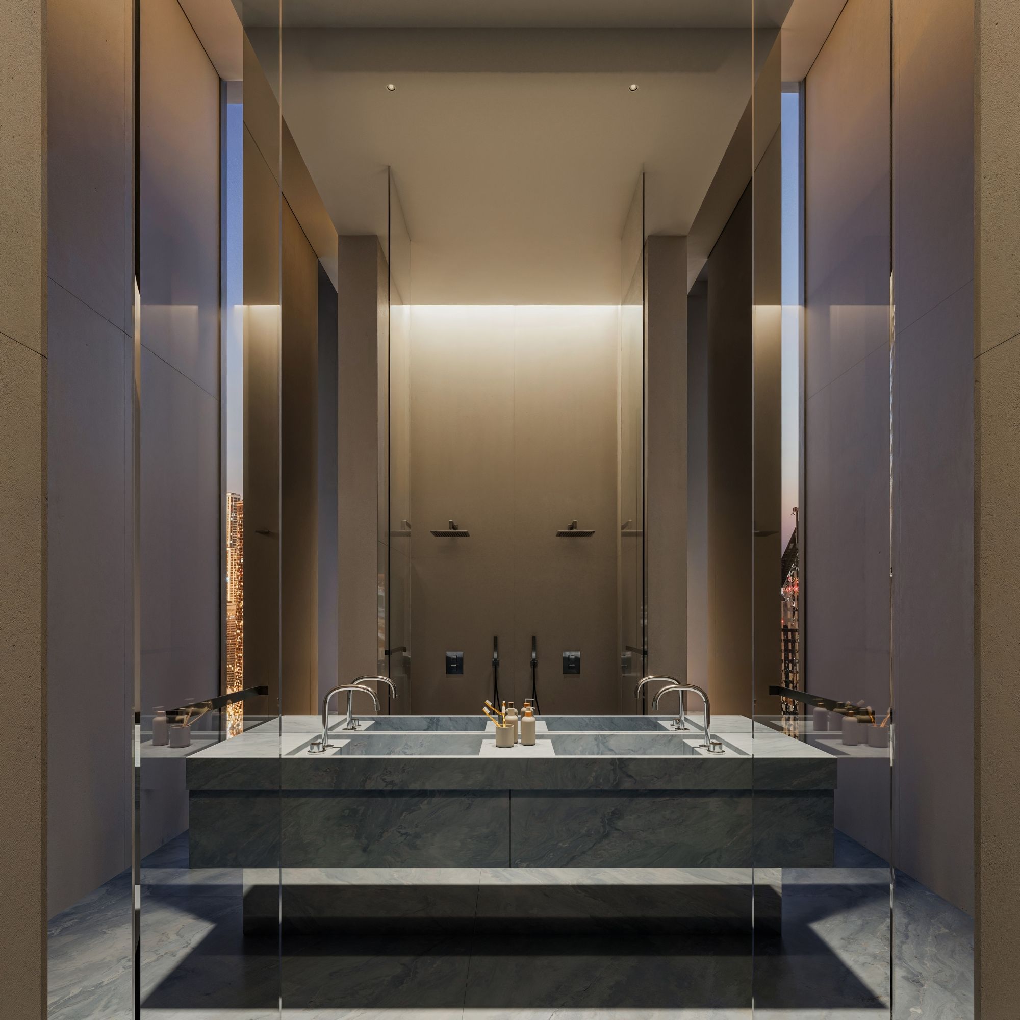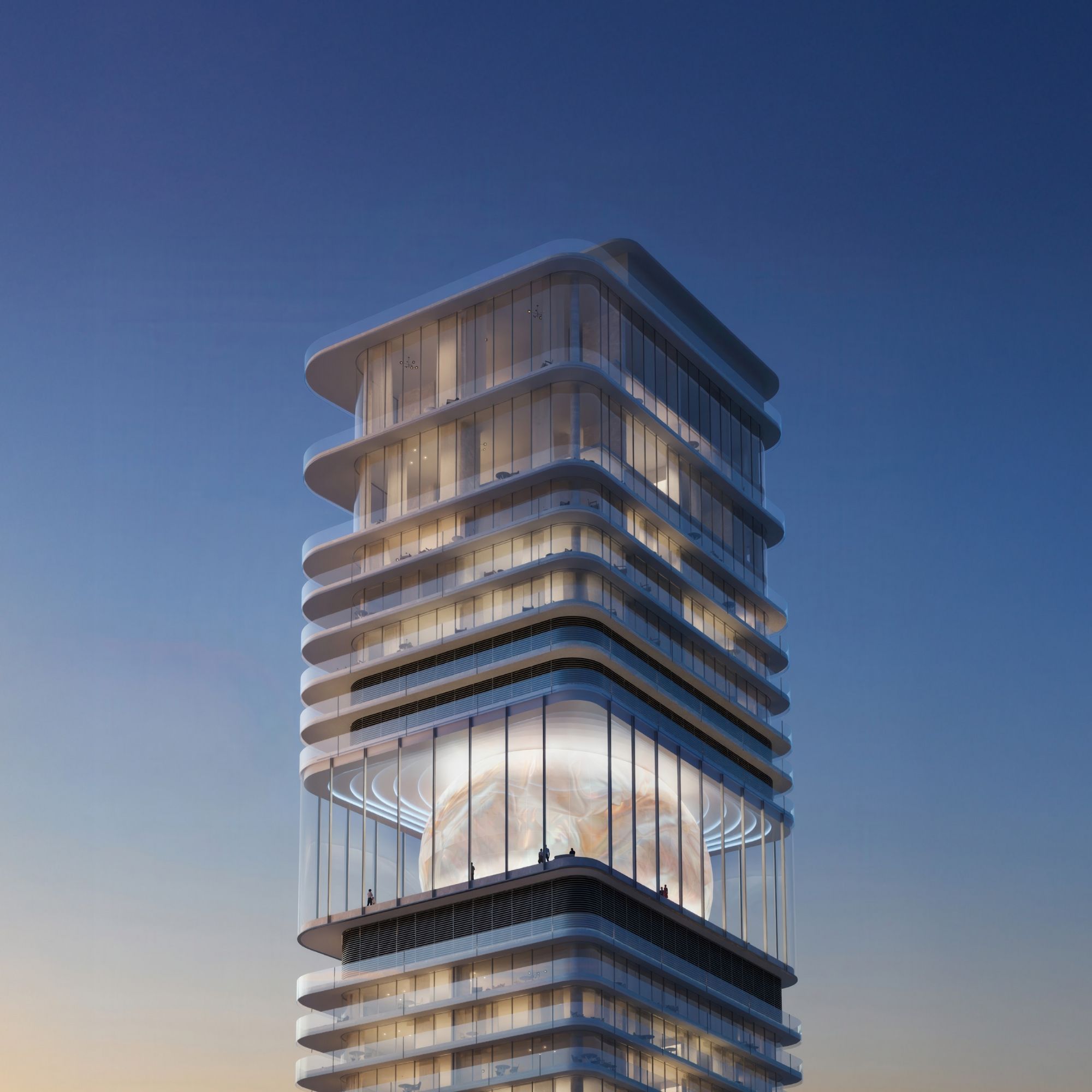 The tower acts as a physical expression of urban life, its architecture capturing the movement and intensity of Downtown Dubai. From the street, the sculpted podium reflects and engages the city, inviting light and activity inward. As it rises, the façade shifts from reflective to transparent, mirroring the transition from urban motion to the stillness of the sky. The tower’s central void defines this change, creating a clear division between the vibrant life below and the calm above.